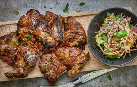 - When your barbecue or grill is ready, cook each chicken or breast in turn for 5 minutes on each side at the centre of the grill, ensuring you don’t burn it. Move the cooked chicken to the outside edges to continue to cook, but less intensively. Then, start the next one at the centre.
